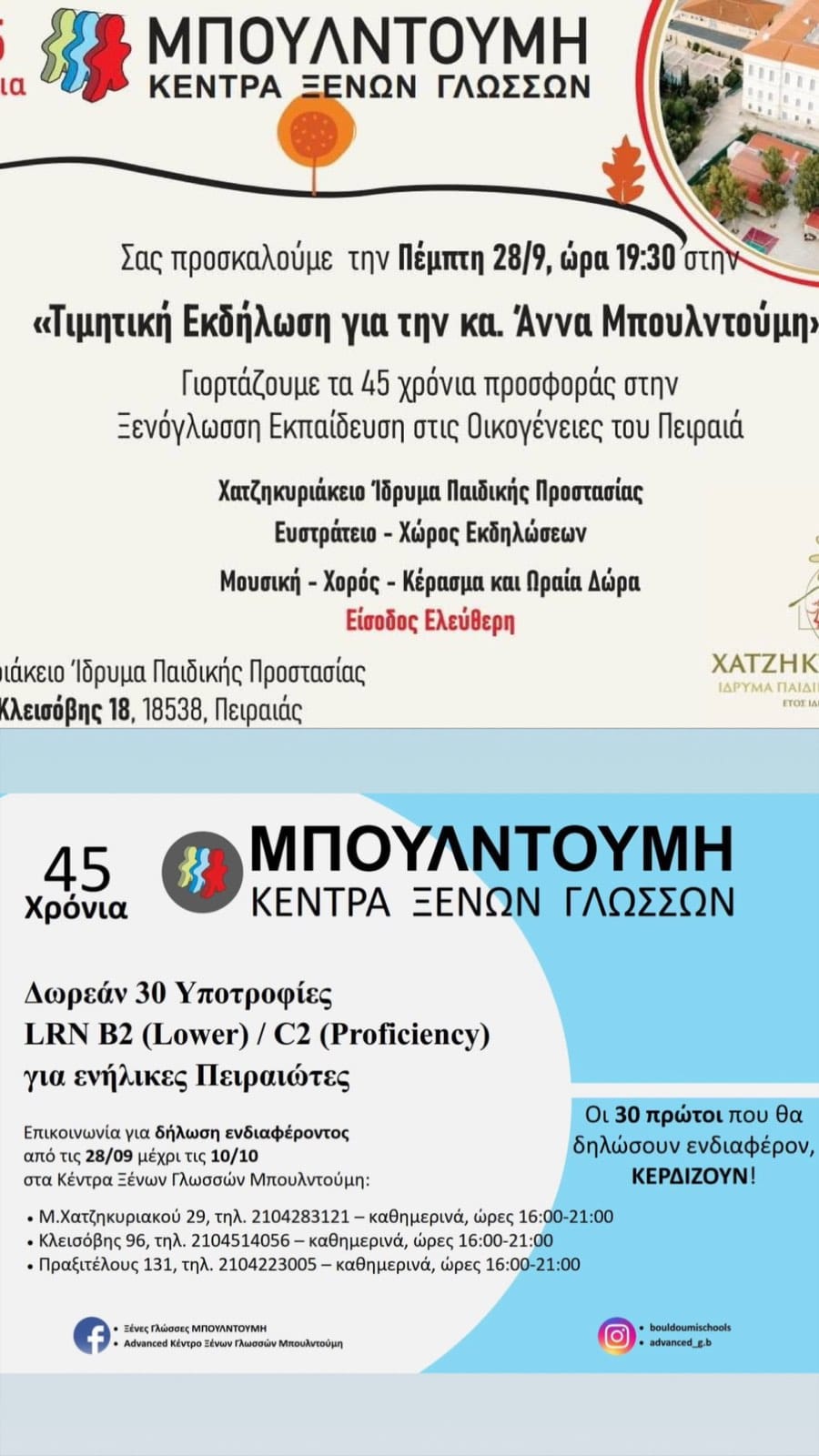 Γιορτάζουμε τα 45 χρόνια προσφοράς μας στην ξενόγλωσση παιδεία στο Πειραιά.Τιμούμε την ιδρύτρια των Κέντρων Ξένων Γλωσσών κα Άννα Μπουλντούμη.Σας προσκαλούμε να μας τιμήσετε με την παρουσία σας και να μοιραστείτε μαζί μας τις αναμνήσεις σας στο Χατζηκυριάκειο Ίδρυμα- Κλεισόβης 18 , Πειραιάς, την Πέμπτη 28 Σεπτεμβρίου 2023 και ώρα 19:30