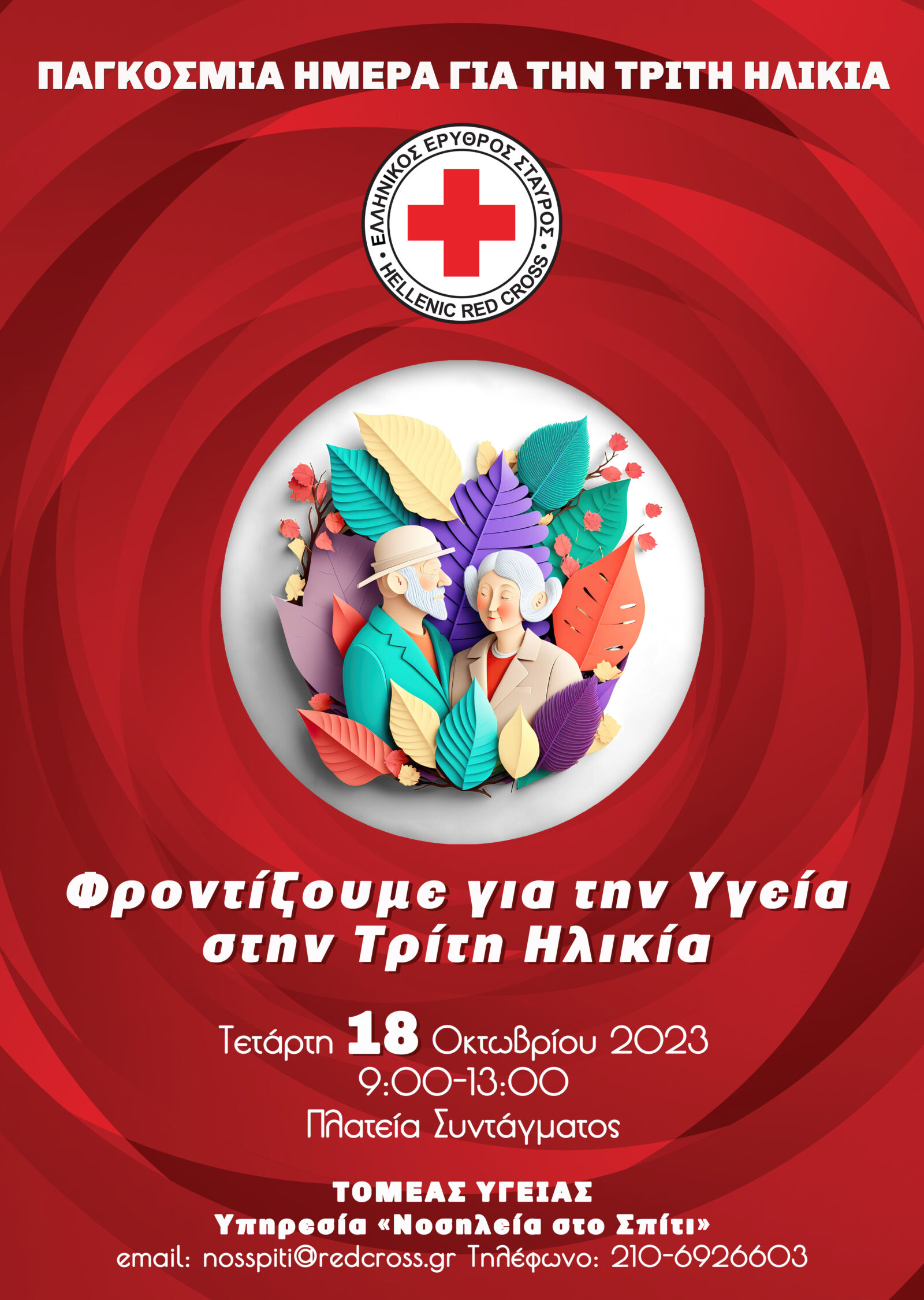Ο Ελληνικός Ερυθρός Σταυρός, στο πλαίσιο εορτασμού της Παγκόσμιας Ημέρας για την Τρίτη Ηλικία, διοργανώνει μεγάλη δράση ευαισθητοποίησης και ενημέρωσης την Τετάρτη 18 Οκτωβρίου 2023 και ώρα 09:00-13:00 στην Πλατεία Συντάγματος, με κεντρικό θέμα “Φροντίζουμε για την Υγεία, στην Τρίτη Ηλικία”.