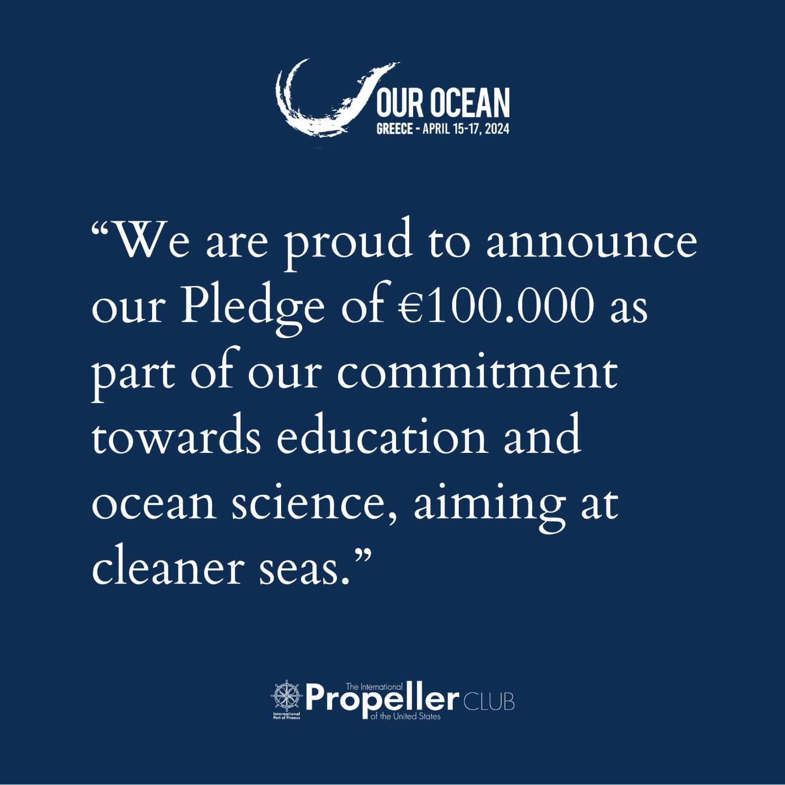 On the occasion of the 9th “Our Ocean Conference”, the Propeller Club, Port of Piraeus, announced a Pledge to provide support to a Greek student aspiring to pursue a Master’s degree at a University in Greece or abroad, in the disciplines of Water Resources Management, Marine Environment, Marine Environmental Protection, Marine Ecology, Marine Environmental Management, and Marine Conservation.
