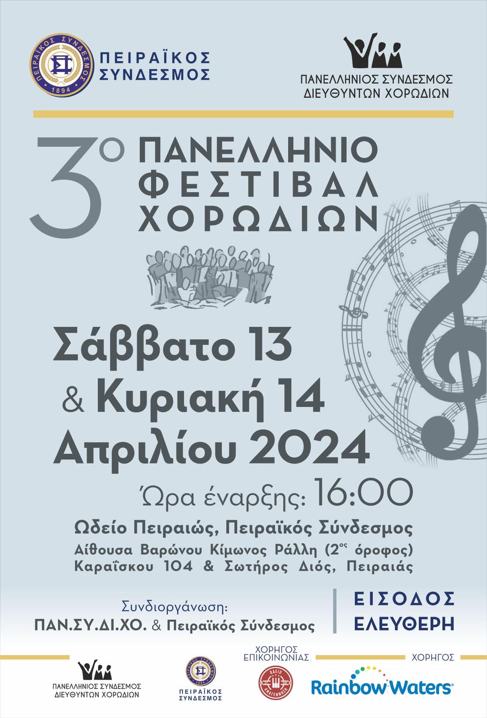 Με μεγάλη χαρά σας προσκαλούμε στο Τρίτο Πανελλήνιο Φεστιβάλ Χορωδιών που θα λάβει χώρα στην αίθουσα Βαρώνου Κίμωνος Ράλλη στο Μέγαρο του Πειραϊκού Συνδέσμου, το Σάββατο 13 και την Κυριακή 14, Απριλίου 2024 στις τέσσερις το απόγευμα.