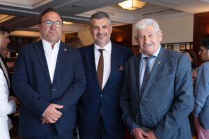 Από αριστερά προς τα δεξιά, βλέπουμε τον CEO-εφοπλιστή συνιδιοκτήτη της GRID Shipping & Capital Ltd. κύριο Σπύρο Τόγια, τον Εφοπλιστή capt Χρήστο Φασουλή, τον εφοπλιστή Δρ. Πάνο Φασουλή Dr. Panos Fasoulis Founding Equity Partner, President of BoD, της εταιρείας φορτηγών πλοίων GRID Shipping & Capital Ltd