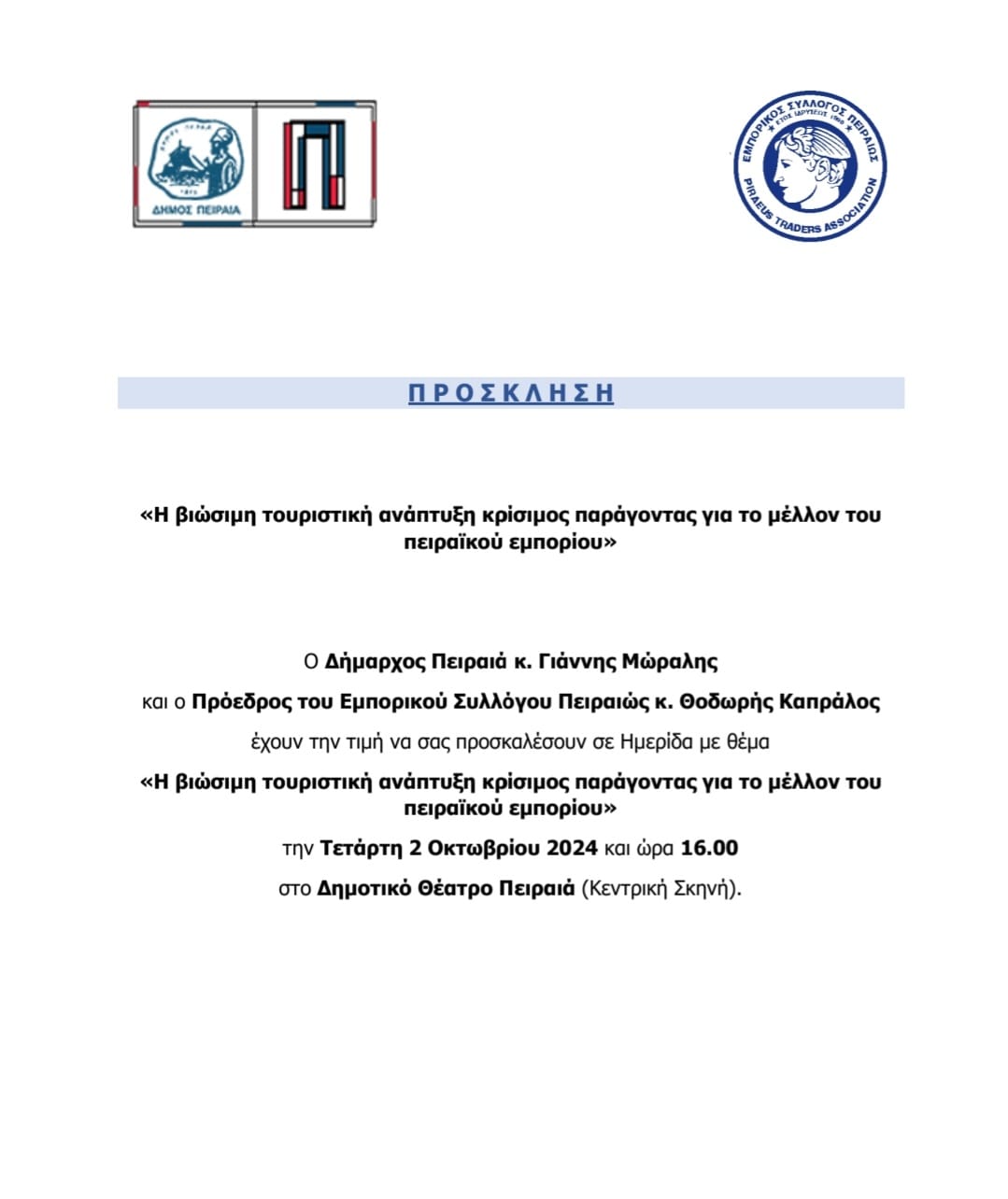 Σας προσκαλούμε σε κοινή ημερίδα που διοργανώνει ο Εμπορικός Σύλλογος Πειραιώς με τον Δήμο Πειραιά, η οποία θα γίνει την Τετάρτη 2 Οκτωβρίου και ώρα 4.00 μ.μ., στο Δημοτικό Θέατρο Πειραιά με θέμα: