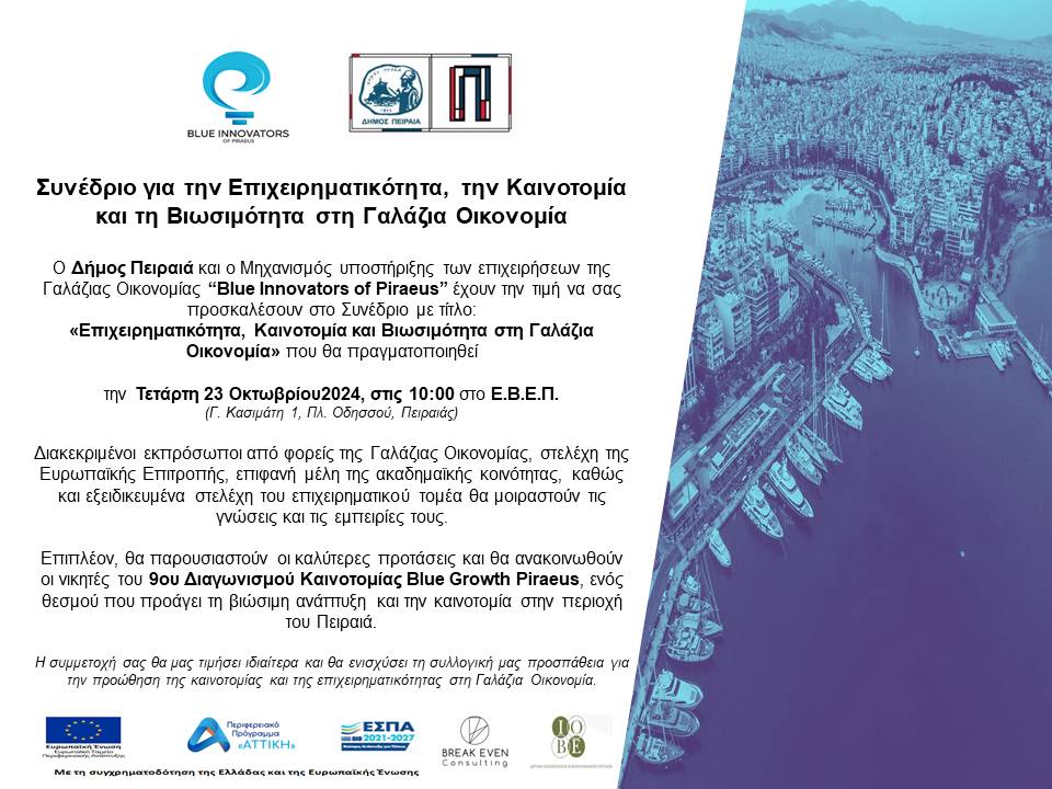 Συνέδριο με τίτλο: «Επιχειρηματικότητα, Καινοτομία και Βιωσιμότητα στη Γαλάζια Οικονομία», που διοργανώνει ο Δήμος Πειραιά και ο μηχανισμός υποστήριξης των επιχειρήσεων της Γαλάζιας Οικονομίας «Blue Innovators of Piraeus», την Τετάρτη 23 Οκτωβρίου, στις 10:00, στο Ε.Β.Ε.Π.