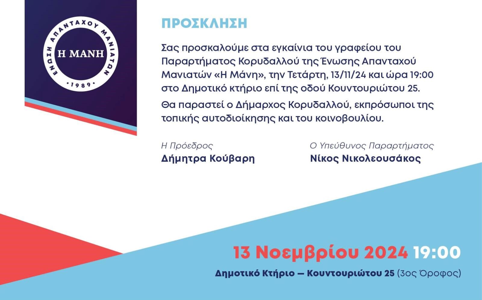 Σας προσκαλούμε στα εγκαίνια του γραφείου του Παραρτήματος Κορυδαλλού της Ένωσης Απανταχού Μανιατών «Η Μάνη», την Τετάρτη, 13/11/24 και ώρα 19:00 στο Δημοτικό κτήριο επί της οδού Κουντουριώτου 25.