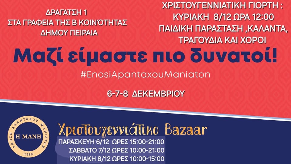 Σας προσκαλούμε την Παρασκευή 06 Δεκεμβρίου 2024 ώρες 15:00-21:00, το Σάββατο 7/12 ,ώρες 10:00-21:00 και την Κυριακή,8/12, ώρες 10:00-15:00 στο Χριστουγεννιάτικο Μπαζαάρ της Ένωσης που θα πραγματοποιηθεί στα γραφεία της Β Δημοτικής Κοινότητας Δήμου Πειραιά στην οδό Δραγάτση Ι. 1Α.