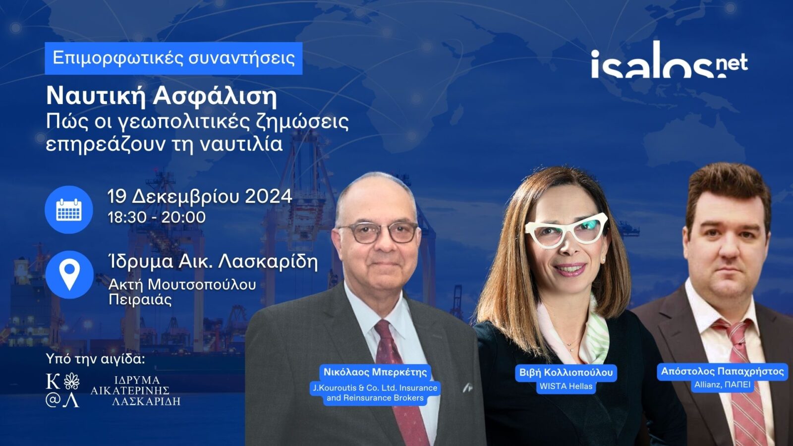 Η Isalos.net, στο πλαίσιο των τακτικών επιμορφωτικών της πρωτοβουλιών ανακοινώνει τη διοργάνωση νέας επιμορφωτικής συνάντησης με θέμα «Ναυτική Ασφάλιση: Πώς οι γεωπολιτικές ζημώσεις επηρεάζουν τη ναυτιλία».