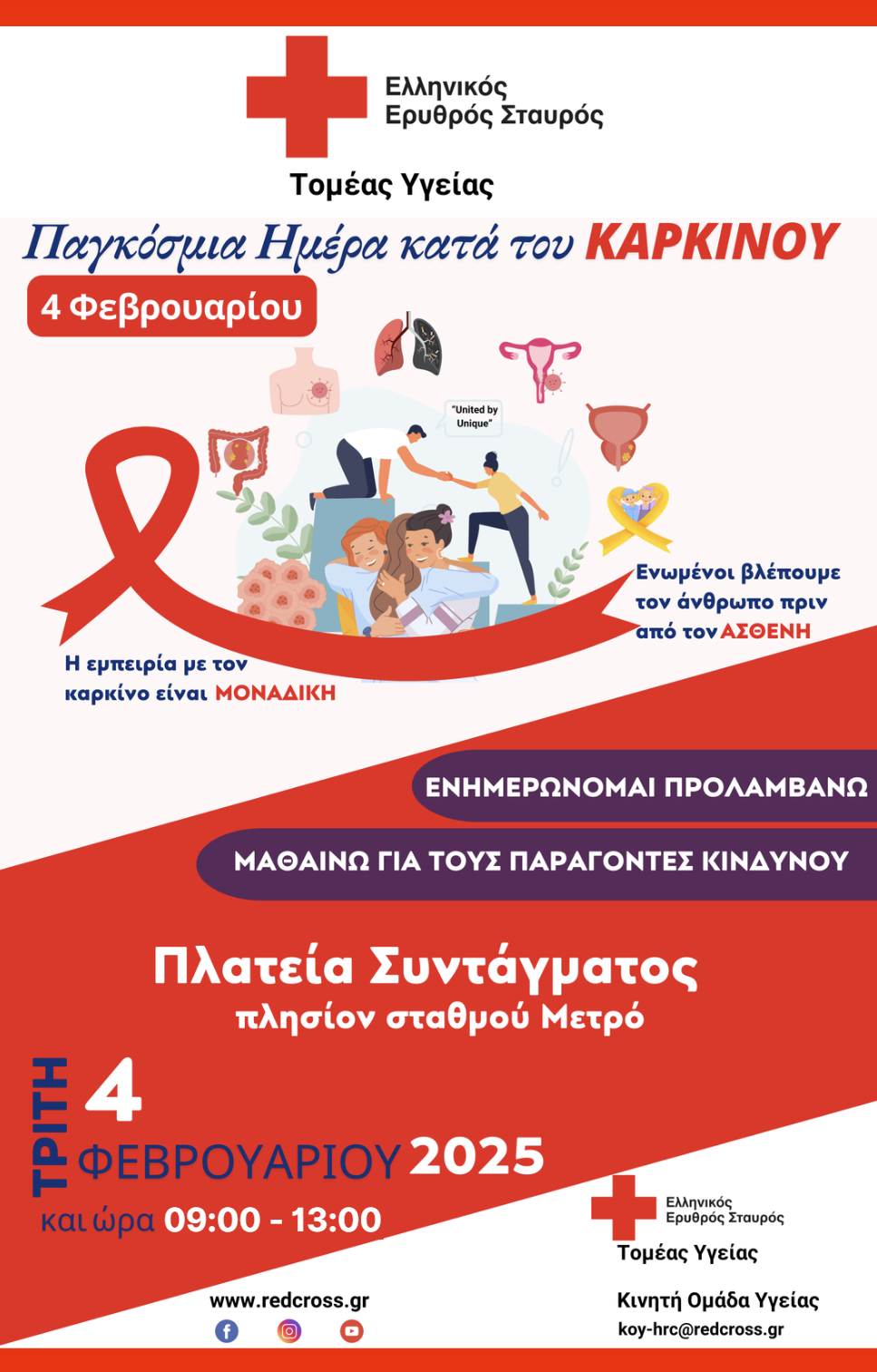 ΟΕλληνικός Ερυθρός Σταυρός (Ε.Ε.Σ.), με αφορμή την Παγκόσμια Ημέρα κατά του καρκίνου (4/2), διοργανώνει μεγάλη δράση ενημέρωσης, εκπαίδευσης και Ευαισθητοποίησης κατά του καρκίνου, την Τρίτη 4 Φεβρουαρίου 2025 και ώρες 09:00-13:00, στην Πλατεία Συντάγματος (πλησίον του Μετρό).