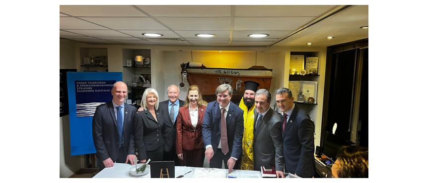 Το Διοικητικό Συμβούλιο και τα μέλη της Ένωσης Τραπεζικών και Χρηματοοικονομικών Στελεχών Ελληνικής Ναυτιλίας συναντήθηκαν την Τετάρτη 29/1/2025 στα γραφεία της Ένωσης για τον καθιερωμένο Αγιασμό και την κοπή της Βασιλόπιτάς τους. Σύσσωμο το Διοικητικό Συμβούλιο το οποίο απαρτίζεται από τους Γιώργο Ξηραδάκη, (Πρόεδρο), Βασίλη Μαντζαβίνο (Αντιπρόεδρο Α), Γιώργο Λάιο (Αντιπρόεδρο Β), Κώστα Οικονόμου (Γενικό Γραμματέα), Κατερίνα Φίτσιου (Ταμία), Κώστα Ιωάννου (Αν. Γεν. Γραμματέα) και Κρυσταλλία Μαρκάκη (Μέλος Δ.Σ.) μαζί με πλήθος μελών συμμετείχαν στον Αγιασμό και στην ευλογία της βασιλόπιτας όπου τελέστηκε από τον Πατέρα Ανδρέα της ενορίας του Αγίου Νικολάου Πειραιά. Την τελετή τίμησε με την παρουσία του ο Υφυπουργός Ναυτιλίας και Νησιωτικής Πολιτικής, Στέφανος Γκίκας και στελέχη του Υπουργείου.