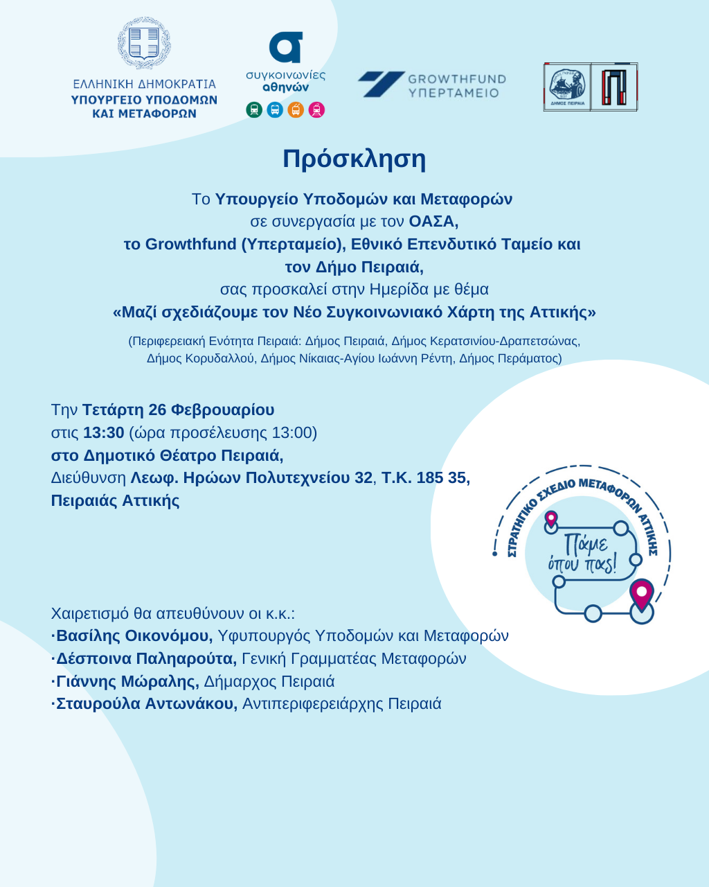 Πρόσκληση και το πρόγραμμα της ημερίδας που διοργανώνει το Υπουργείο Υποδομών και Μεταφορών σε συνεργασία με τον ΟΑΣΑ, το Growthfund (Υπερταμείο), το Εθνικό Επενδυτικό Ταμείο και τον Δήμο Πειραιά, με θέμα: