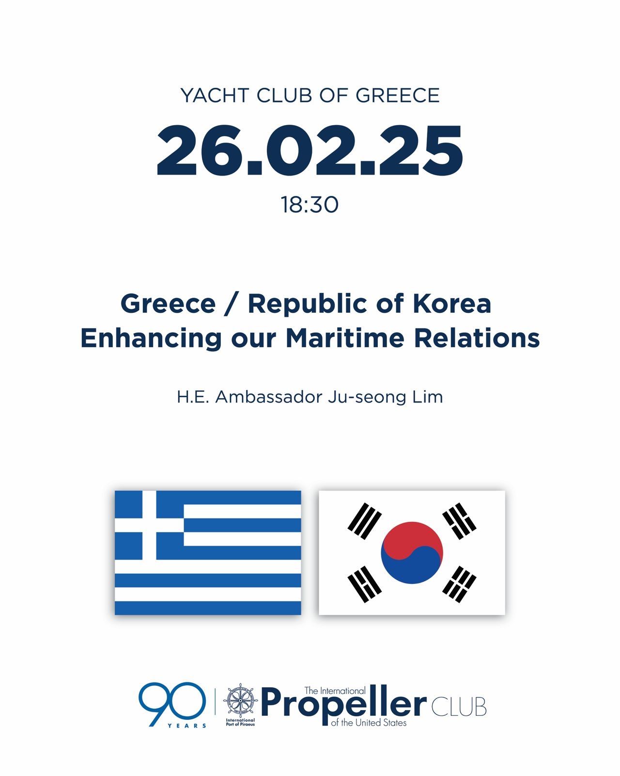 Tην Τετάρτη 26 Φεβρουαρίου, θα φιλοξενήσουμε στη “Συνάντηση Μελών” του Club μας τον Πρέσβη της Δημοκρατίας της Κορέας στην Ελλάδα, κ. Ju-seong Lim, ο οποίος θα μιλήσει με θέμα: «Greece / Republic of Korea: Enhancing our Maritime Relations».