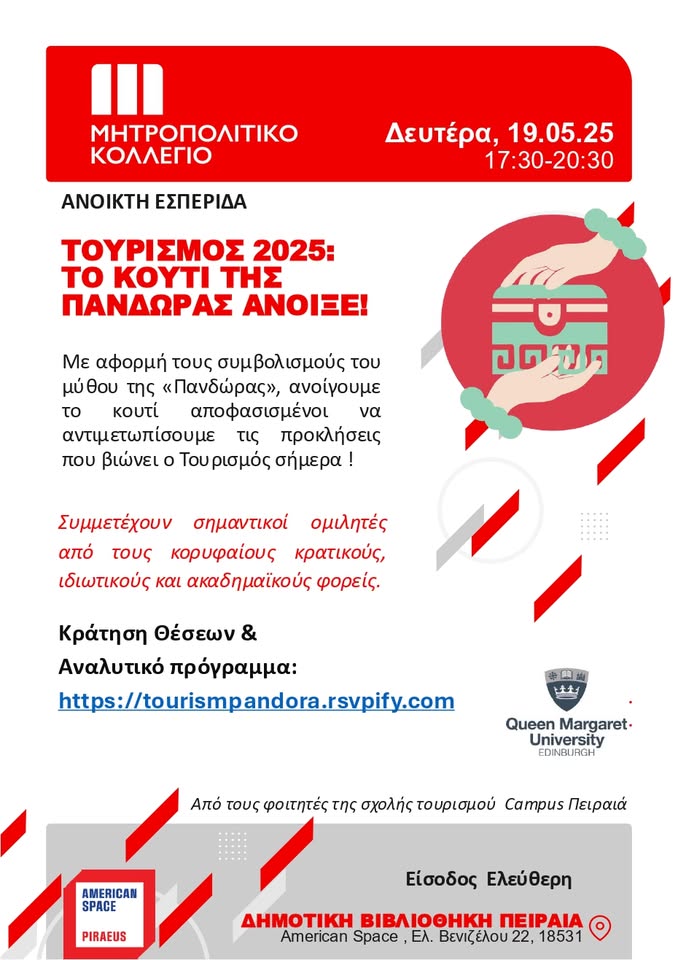 Την Δευτέρα 19 Μαΐου και ώρα 17:30, η Σχολή Τουρισμού του Μητροπολιτικού Κολλεγίου (Campus Πειραιά), οργανώνει εσπερίδα με θέμα «Τουρισμός 2025: Το κουτί της Πανδώρας άνοιξε!».