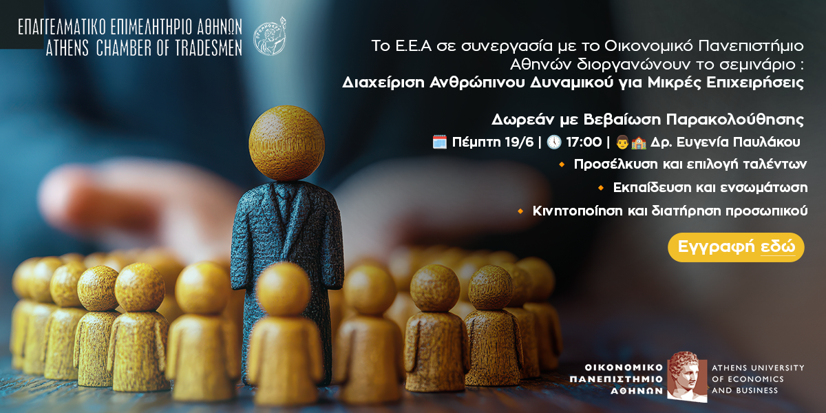 Με το τέταρτο webinar, με θέμα “Διαχείριση Ανθρώπινου Δυναμικού για Μικρές Επιχειρήσεις“, συνεχίζεται ο νέος κύκλος δωρεάν διαδικτυακών σεμιναρίων, που διοργανώνει το Επαγγελματικό Επιμελητήριο Αθηνών (Ε.Ε.Α.) και το Οικονομικό Πανεπιστήμιο Αθηνών (Ο.Π.Α.), με τη συμμετοχή διακεκριμένων εισηγητών και ακαδημαϊκών.