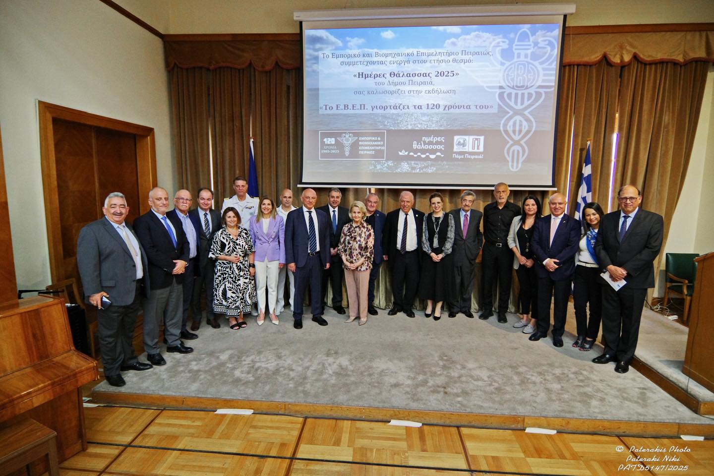 Σε ατμόσφαιρα συγκίνησης και υπερηφάνειας πραγματοποιήθηκε χθες η επετειακή εκδήλωση για τον εορτασμό των 120 χρόνων από την ίδρυση του Εμπορικού και Βιομηχανικού Επιμελητηρίου Πειραιώς, στο ιστορικό Μέγαρο του Επιμελητηρίου, συγκεντρώνοντας πλήθος επιχειρηματιών, εκπροσώπων της πολιτείας, θεσμικών, παραγωγικών, επιστημονικών φορέων και μελών της τοπικής κοινωνίας. Την εκδήλωση τίμησαν με την παρουσία τους οι Α.Ε. πρέσβεις της Αλγερίας, Zaina Benhabouche και του Μεξικού, Alejandro Garcia Moreno, πλαισιωμένοι από στελέχη των διπλωματικών τους αποστολών, υψηλόβαθμα στελέχη του Λιμενικού Σώματος και του Πολεμικού Ναυτικού.