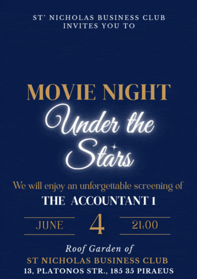 Είμαστε στην ευχάριστη θέση να σας προσκαλέσουμε την Τετάρτη 4 Ιουνίου 2025 και ώρα 21:00, σε μία ξεχωριστή κινηματογραφική βραδιά, που θα πραγματοποιηθεί στο καλοκαιρινό “ROOF GARDEN” του St’ Nicholas Business Club, σε ένα άκρως ατμοσφαιρικό περιβάλλον κάτω από το φως των αστεριών.