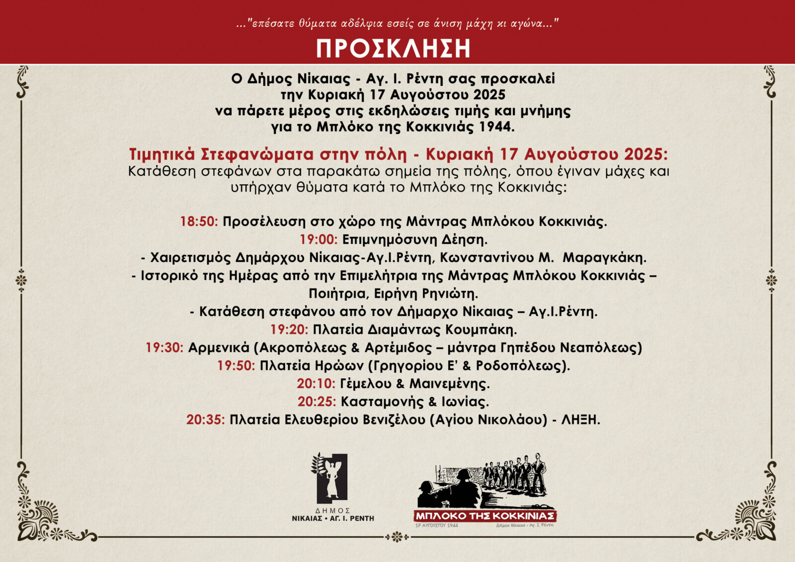 Ο Δήμος Νίκαιας – Αγ. Ι. Ρέντη διοργανώνει την Κυριακή 17 Αυγούστου 2025 εκδηλώσεις τιμής και μνήμης για το Μπλόκο της Κοκκινιάς του 1944, μία από τις πιο μαύρες σελίδες της νεότερης ελληνικής ιστορίας.