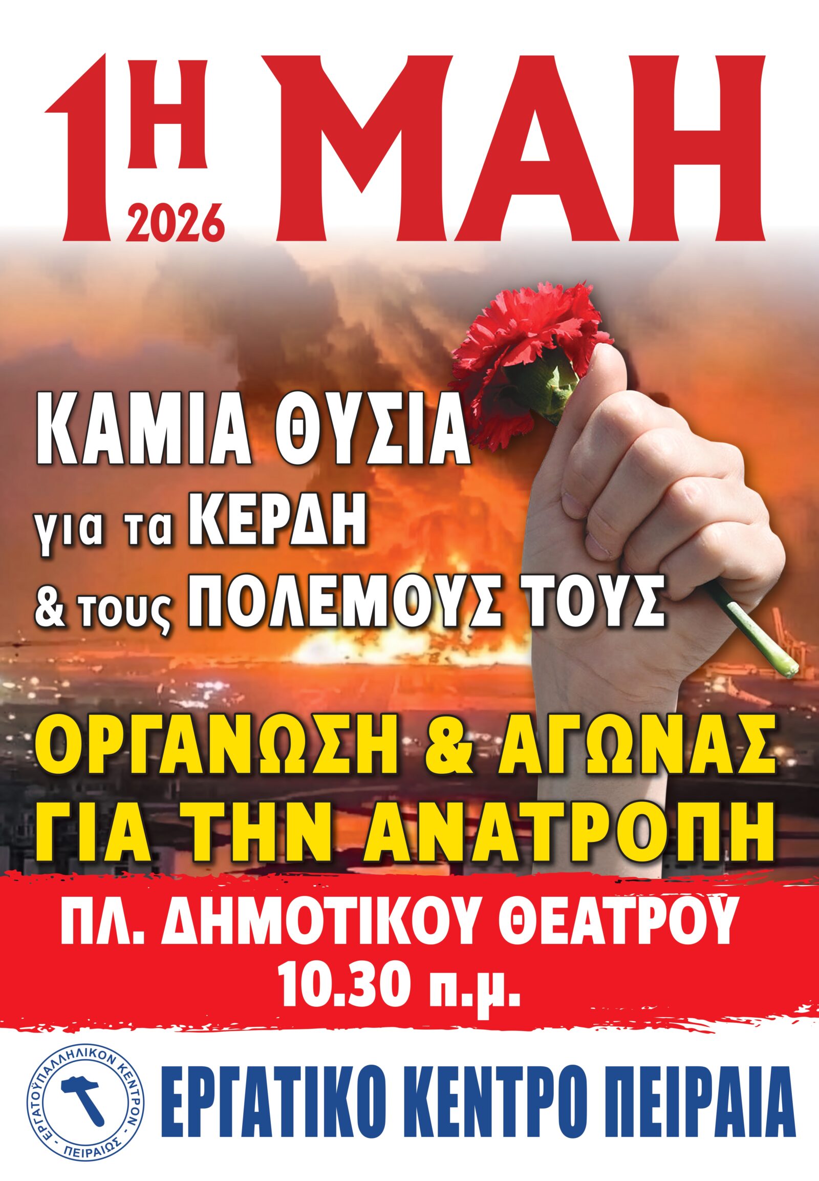 ΌΛΕΣ και ΌΛΟΙ στις 10:30 π.μ. στην Πρωτομαγιάτικη απεργιακή συγκέντρωση του Εργατικού Κέντρου Πειραιά στην πλατεία Δημοτικού Θεάτρου στον Πειραιά.