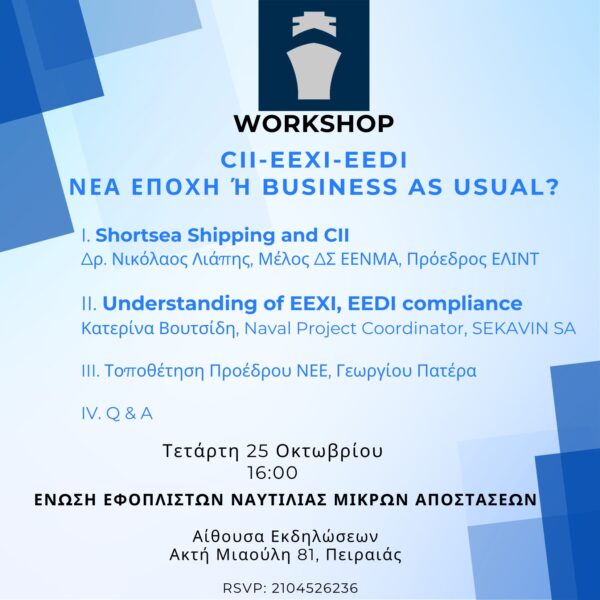 By piraeus365Workshop με θέμα: “CII-EEXI-EEDI Νεα εποχή ή business as usual?” Την Τετάρτη 25 Οκτωβρίου και ώρα 16:00 στην Αίθουσα Εκδηλώσεων της ΕΕΝΜΑ , ...