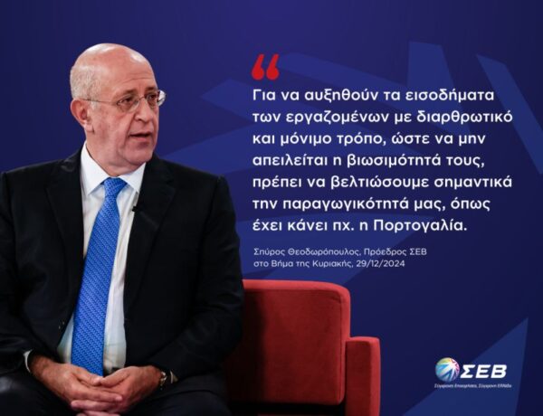 By piraeus365Σπύρος Θεοδωρόπουλος, Πρόεδρος ΣΕΒ, στο πρόσφατο συνέδριο του SETE – Greek Tourism Confederation, 19/12/2024: “Η χώρα χρειάζεται αλλαγή στο οικονομικό της μοντέλο. Με...