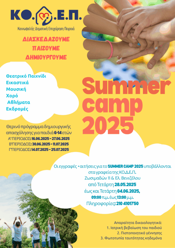 By piraeus365Ξεκινούν οι εγγραφές για το καθιερωμένο Summer Camp που διοργανώνει η Κοινωφελής Δημοτική Επιχείρηση του Δήμου Πειραιά (ΚΟ.Δ.Ε.Π.), προσφέροντας μια μοναδική ευκαιρία για...