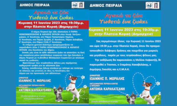 By piraeus365Την ετήσια εκδήλωση φιλοζωίας «Αγαπώ τα Ζώα – Υιοθετώ ένα Ζωάκι» διοργανώνει ο Δήμος Πειραιά την Κυριακή 11 Ιουνίου, στις 19:30 το απόγευμα,...