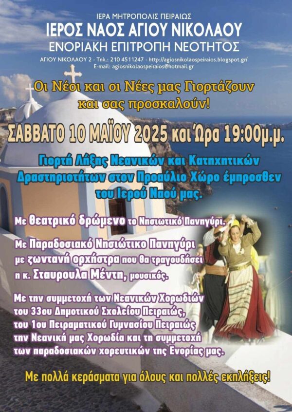 By piraeus365Νεότητα Αγ. Νικολάου Πειραιώς Οι Νέοι μας Γιορτάζουν και σας προσκαλούν!!!ΣΑΒΒΑΤΟ 10/5/25 & Ώρα 19:00 μ.μ.στον Προαύλιο Χώρο του Ιερού Ναού μας. Σας...