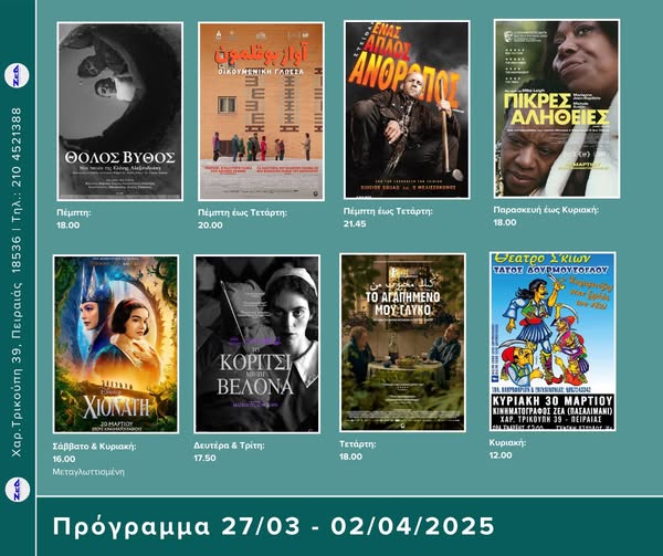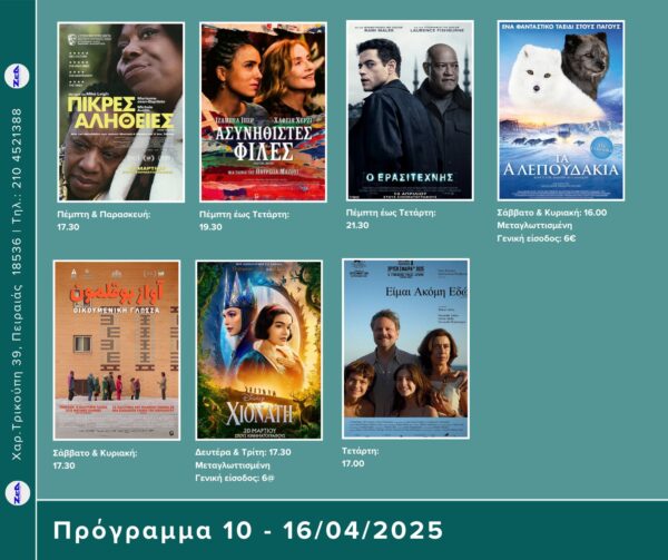 By piraeus365Νέο πρόγραμμα στο Zea, από 10 έως 16 Απριλίου! ΠΙΚΡΕΣ ΑΛΗΘΕΙΕΣ (97’) Πέμπτη & Παρασκευή: 17.30 ΑΣΥΝΗΘΙΣΤΕΣ ΦΙΛΕΣ (109’) Πέμπτη έως Τετάρτη: 19.30...