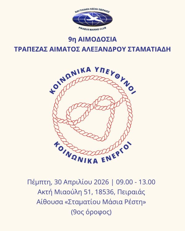 Η Ναυτιλιακή Λέσχη Πειραιώς συνεχίζει έμπρακτα τη συμβολή της στην κοινωνία, διοργανώνοντας την 9η Εθελοντική Αιμοδοσία της Τράπεζας Αίματος «Αλέξανδρος Σταματιάδης». Η Τράπεζα...