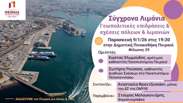 By piraeus365Η δημοτική παράταξη «ΑλλάΖΟΥΜΕ τον Πειραιά για όλους & όλες» σας καλεί στην εκδήλωση/συζήτηση με θέμα: Σύγχρονα Λιμάνια Γεωπολιτικές επιδράσεις & σχέσεις...