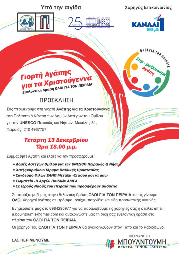 By piraeus365Τα Κέντρα Ξένων Γλωσσών Μπουλντούμη σας προσκαλούν στη Χριστουγεννιάτικη Γιορτή Αγάπης, την Τετάρτη 13 Δεκεμβρίου και ώρα 18:00 μ.μ, Μυκάλης 51 στο Πολιτιστικό Κέντρο των Δομών Αστέγων του...