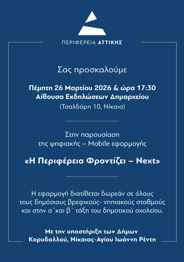 By piraeus365Η Περιφέρεια Αττικής παρουσιάζει την ψηφιακή πλατφόρμα- mobile εφαρμογή «Η Περιφέρεια Φροντίζει- Next», η οποία απευθύνεται στις δημόσιες σχολικές δομές και έχει στόχο...