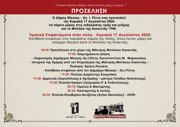 By piraeus365Εκδηλώσεις Μνήμης για το Μπλόκο της Κοκκινιάς – 17 Αυγούστου 2025 Τιμητικά Στεφανώματα στην πόλη Ο Δήμος Νίκαιας – Αγ. Ι. Ρέντη ...
