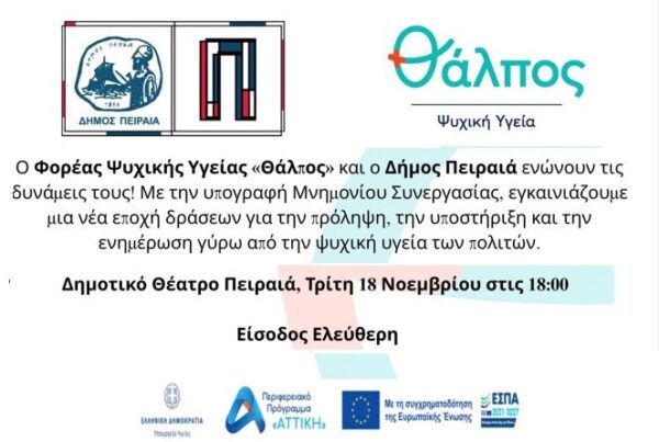 By piraeus365Ο Φορέας Ψυχικής Υγείας «Θάλπος» και ο Δήμος Πειραιά ενώνουν τις δυνάμεις τους για την ψυχική υγεία των πολιτών. Υπογραφή Μνημονίου Συνεργασίας &...