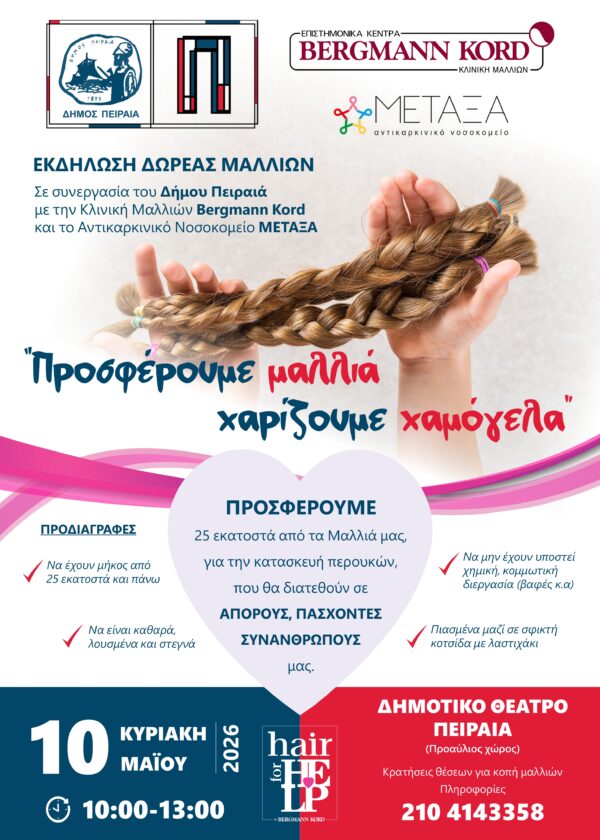 Εκδήλωση δωρεάς μαλλιών: «Προσφέρουμε μαλλιά – Χαρίζουμε χαμόγελα» Μια πράξη αλληλεγγύης στον Δήμο Πειραιά Ο Δήμος Πειραιά, σε συνεργασία με το Αντικαρκινικό...
