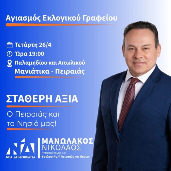 Πρόσκληση από τον υποψήφιο βουλευτή κ.Νικόλαο Μανωλάκο σε Αγιασμό του εκλογικού κέντρου -πολιτικού του γραφείου: Ο εκλογικός μου αγώνας ξεκινάει από το σημείο...