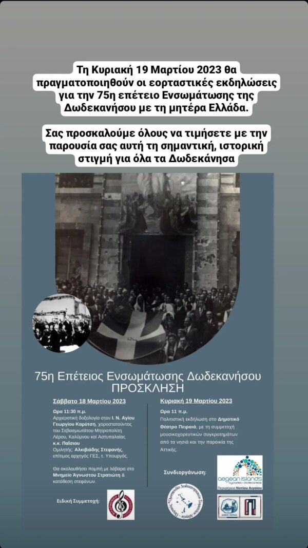 By piraeus365Ο Όμιλος Καρπαθίων Νέων προσκαλεί σε Εορταστικές εκδηλώσεις για την 75η επέτειο Ενσωμάτωσης της Δωδεκανήσου με την μητέρα Ελλάδα, την Κυριακή 19 Μαρτίου...