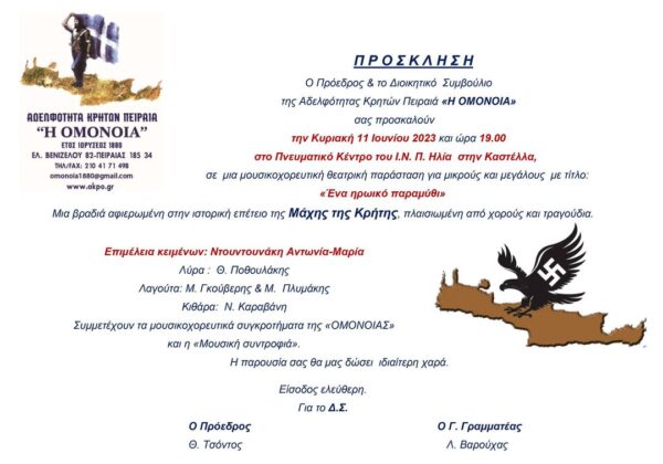 Η Αδελφότητα Κρητών Πειραιά “Η Ομόνοια” εορτάζει την 82η επέτειο της Μάχης της Κρήτης με μια μουσικοχορευτική θεατρική παράσταση για μικρούς και μεγάλους...