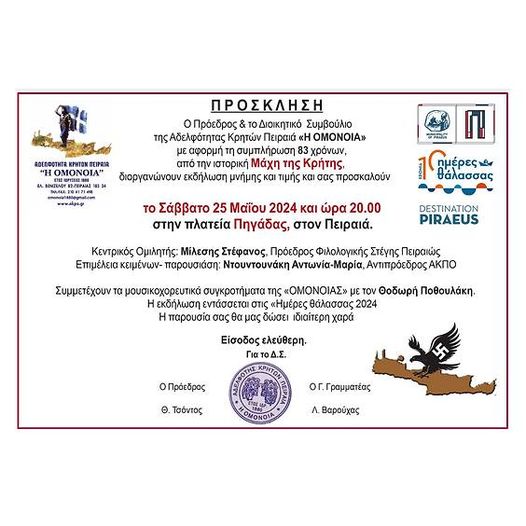 By piraeus36510 χρόνια Ημέρες Θάλασσας Επετειακή εκδήλωση για τη μάχη της Κρήτης Η Αδελφότητα Κρητών Πειραιά «Η ΟΜΟΝΟΙΑ» παρουσιάζει επετειακή εκδήλωση για τη Μάχη...