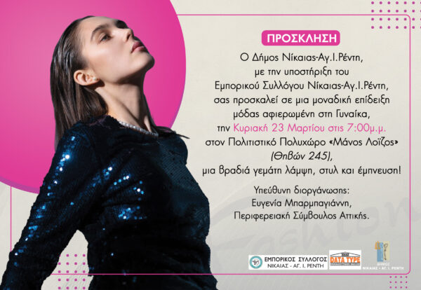 By piraeus365Επίδειξη Μόδας Αφιερωμένη στη Γυναίκα στον Πολιτιστικό Πολυχώρο «Μάνος Λοϊζος» Μια ξεχωριστή Επίδειξη Μόδας αφιερωμένη στη Γυναίκα, διοργανώνει ο Δήμος Νίκαιας –...