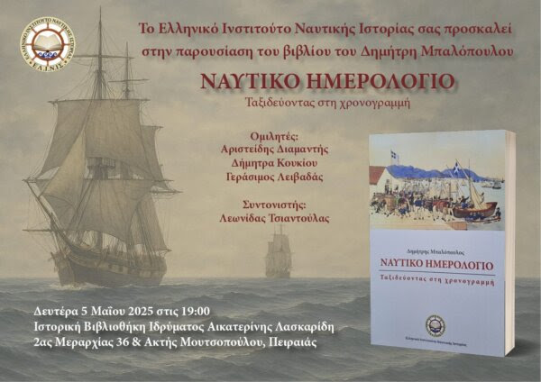 By piraeus365Παρουσίαση νέας έκδοσης: “Ναυτικό Ημερολόγιο. Ταξιδεύοντας στη χρονογραμμή” Το Ελληνικό Ινστιτούτο Ναυτικής Ιστορίας (ΕΛ.Ι.Ν.ΙΣ.) σας προσκαλεί στην επίσημη παρουσίαση του βιβλίου του Δημήτρη...