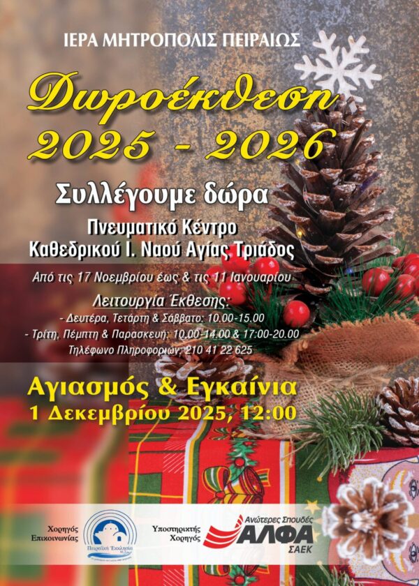 Τα εγκαίνια της Χριστουγεννιάτικης Δωροέκθεσης της Ιεράς Μητροπόλεως Πειραιώς, θα τελέσει τη Δευτέρα 1 Δεκεμβρίου 2025, στις 12:00 το μεσημέρι ο Σεβασμιώτατος Μητροπολίτης...