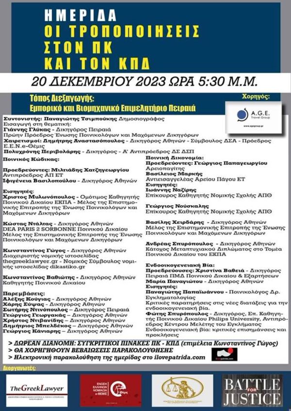 By piraeus365Ημερίδα για τις τροποποιήσεις στον Ποινικό Κώδικα και στον Κώδικα Ποινικής Δικονομίας, πραγματοποιείται αύριο, Τετάρτη, 20 Δεκεμβρίου στο Εμπορικό και Βιομηχανικό Επιμελητήριο Πειραιά, στις...