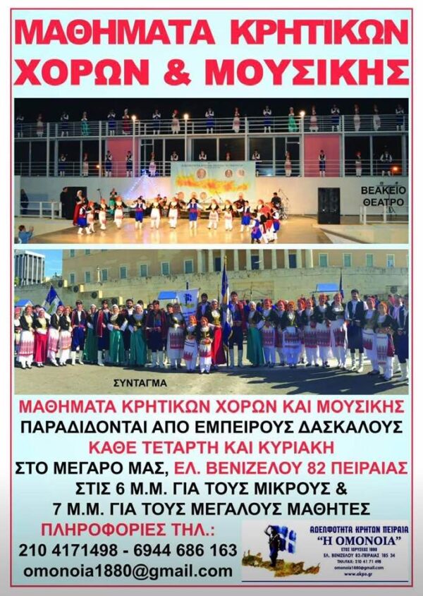 By piraeus365Καλό μήνα… Τα μαθήματα χορού και μουσικής θα αρχίσουν την Τετάρτη 27 Σεπτεμβρίου. Η ΙΣΤΟΡΙΑ ΤΗΣ ΟΜΟΝΟΙΑΣ H Αδελφότητα Κρητών Πειραιά «Η OMONOIA»...