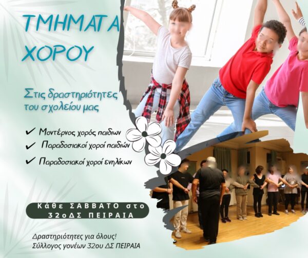 Τμήματα μοντέρνων και παραδοσιακών χορών πραγματοποιούνται κάθε Σάββατο στο χώρο του σχολείου μας! Ώρες μαθημάτων 11.00 -12.00, 12.00-13.00 μοντέρνος χορός για παιδιά 13.00-14.00...