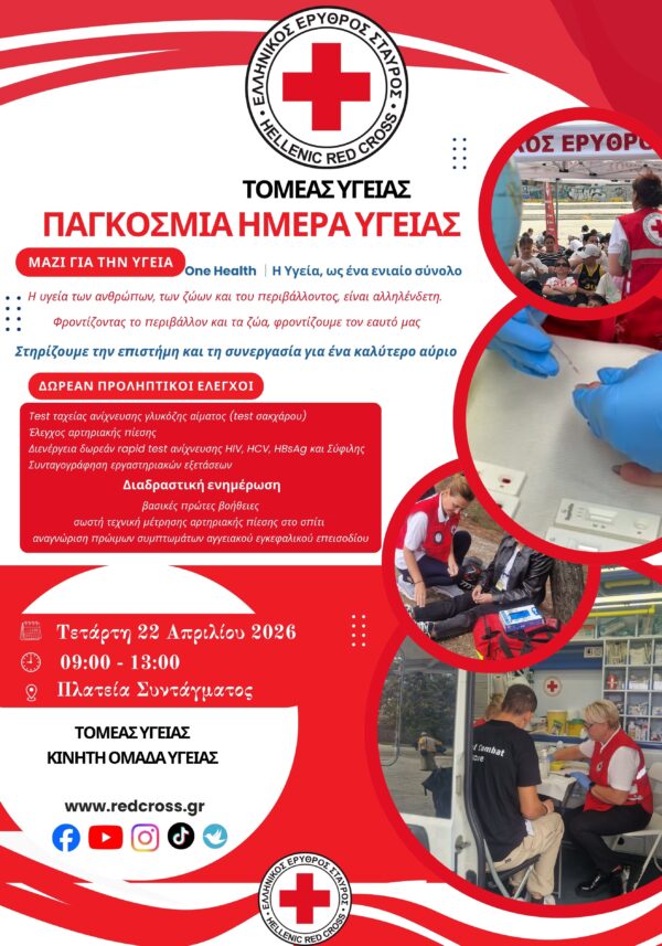 Ο Ελληνικός Ερυθρός Σταυρός (ΕΕΣ),με αφορμή την Παγκόσμια Ημέρα Υγείας,διοργανώνει δράση ενημέρωσης και πρόληψης, την Τετάρτη 22 Απριλίου 2026, από τις 09:00 έως...