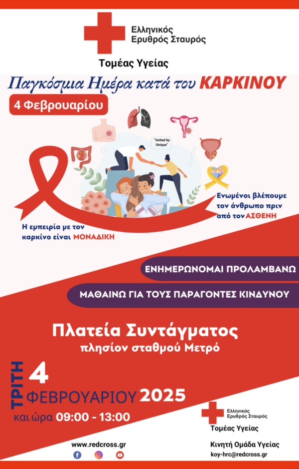 By piraeus365Ο Ελληνικός Ερυθρός Σταυρός διοργανώνει μεγάλη δράση ενημέρωσης και ευαισθητοποίησης για τον καρκίνο στην Πλατεία Συντάγματος (4/2) ΟΕλληνικός Ερυθρός Σταυρός (Ε.Ε.Σ.), με...