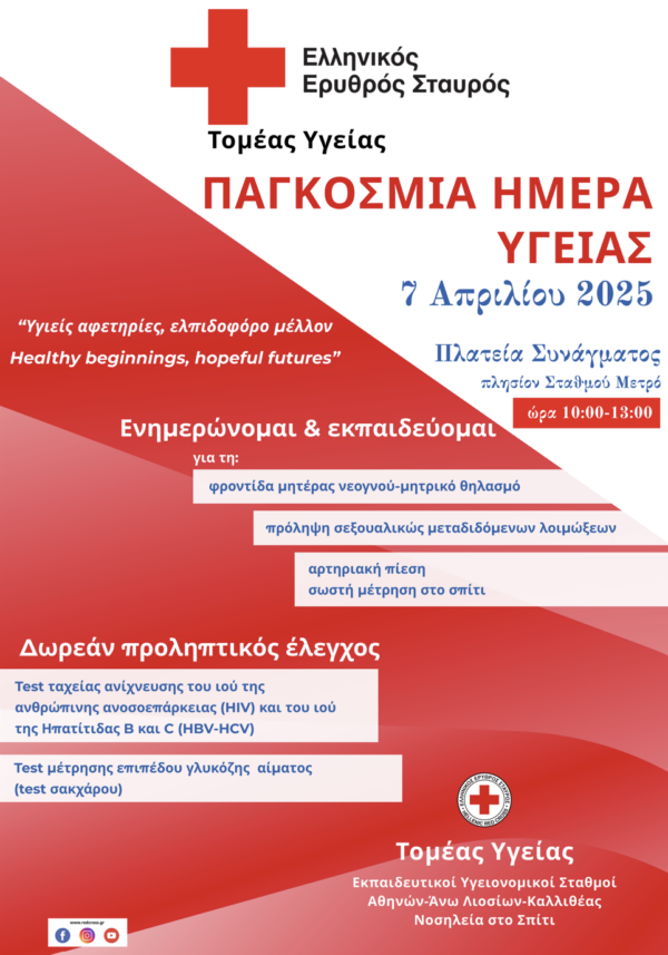 By piraeus365Ο Ελληνικός Ερυθρός Σταυρός (Ε.Ε.Σ.), στο πλαίσιο εορτασμού τηςΠαγκόσμιαςΗμέραςΥγείας, διοργανώνει μεγάλη δράση στην Πλατεία Συντάγματος (πλησίον του μετρό), την Δευτέρα 7 Απριλίου και...