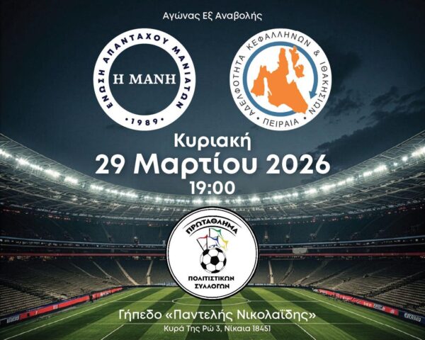 Ανακοίνωση από την Ένωση Απανταχού Μανιατών “Η ΜΑΝΗ” Σας περιμένουμε στον τελευταίο αγώνα της ποδοσφαιρικής μας ομάδας στα πλαίσια του Πολιτιστικού Πρωταθλήματος Αττικής...