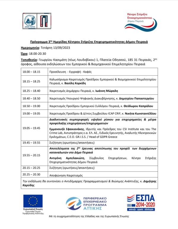 ΑΝΑΚΟΙΝΩΣΗ Ο Δήμος Πειραιά, ο Εμπορικός Σύλλογος Πειραιώς και το Κέντρο Στήριξης Επιχειρηματικότητας του Δήμου Πειραιά συνδιοργανώνουν Ημερίδα με θεματολογία: “Διαδικτυακές συμπεριφορές υψηλού...