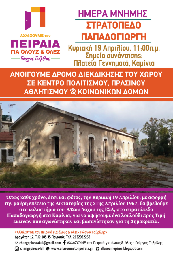 Ημέρα Μνήμης | Στρατόπεδο Παπαδογιωργή Κυριακή 19 Απριλίου στις 11:00 Σημείο συνάντησης: Πλατεία Γεννηματά, Καμίνια Ανοίγουμε δρόμο διεκδίκησης του χώρου,...