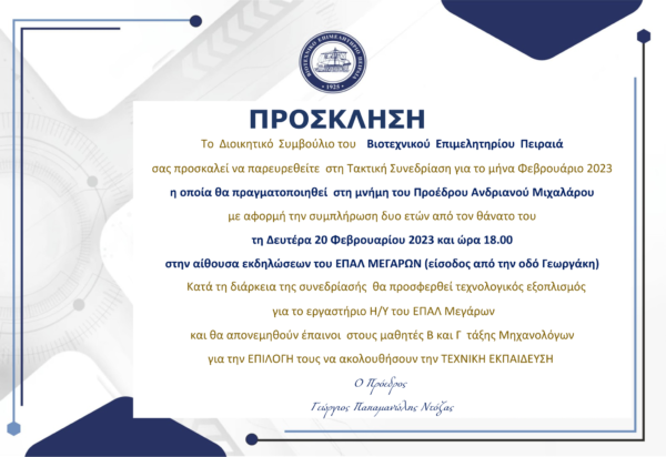Στο ΕΠΑΛ Μεγάρων η τακτική συνεδρίαση του Δ.Σ. Β.Ε.Π., για τον μήνα Φεβρουάριο 2023 στη μνήμη του προέδρου Ανδριανού Μιχάλαρου Ο Πρόεδρος του...